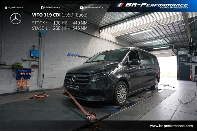 Optimisation du stage 1 sur mon Vito 2024, 119 avec transmission intégrale, passé de 190 chevaux à 267 chevaux, un véhicule qui marchait déjà bien, maintenant il marche très bien, très bon rapport de puissance et de qualité d'accélération malgré le poids du véhicule, troisième expérience avec BR performance de Lyon, une équipe au top, merci